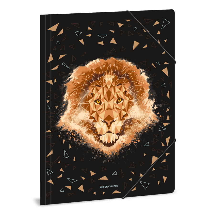 A/4 méretű gumis dosszié oroszlános grafikával iratok, füzetek tárolására. 350 gr-os vastag kartonból, színes gumi zárópánttal.