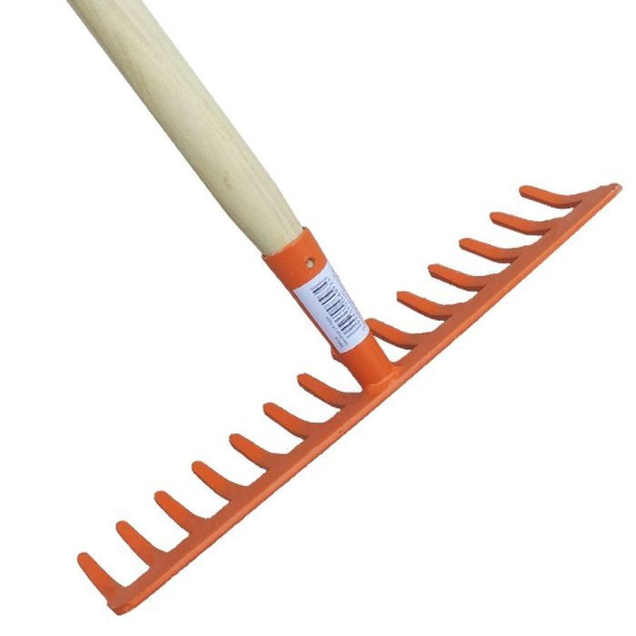 Nyelezett, 16 fogú lemezgereblye, masszív acél fejjel és erős fa nyéllel.