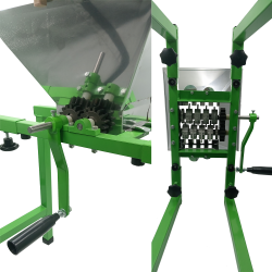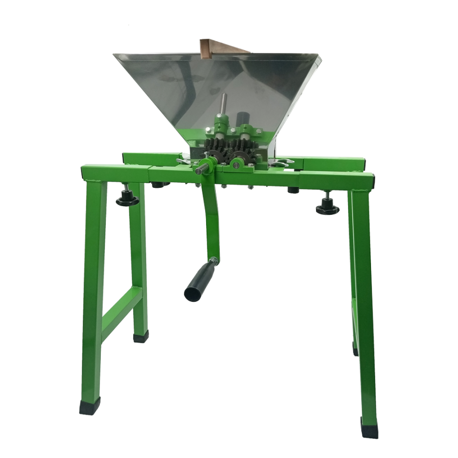 7 literes, lábakon álló gyümölcsmalom, kézi hajtással.
