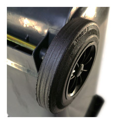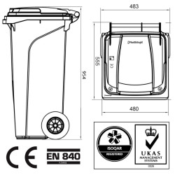 • Sötét szürke színű háztartási szemetes kuka, újrahasznosított alapanyagból készült. Űrtartalma 120 liter. CE jelöléssel ellátott, az EN 840-1 szabványnak megfelelő. Gépi ürítésre alkalmas. Terhelhetősége max. 60 kg. A háztartási kuka könnyű mozgatás elősegíti egy pár 20cm átmérőjű kerék. A 120 literes szürke háztartási forró hamu tárolására nem használható.