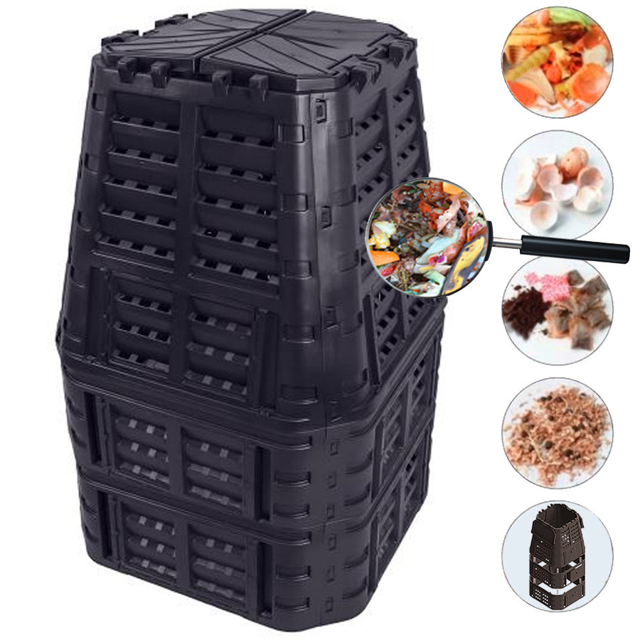 • Az intenzív szellőzés jelentősen csökkenti a hulladék súlyát és térfogatát, valamint a PH érték változása csökkenti a kellemetlen szag kiáramlását is. A komposztáló láda 1000 literes (nettó 880 liter) műanyag. Kerti, illetve zöld hulladék komposztálására, tárolására. A komposztáló 146 cm magas, alsó mérete 93 x 93 cm, felső mérete 60 x 60 cm. Felül (és alul nyitható), levegőzik, szerszám nélkül összeszerelhető. Űrtartalma 880 liter.