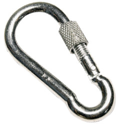 Nagyméretű, 100 mm-es menetes karabiner horganyzott acélból, biztonságos záródással és nagy teherbírással.