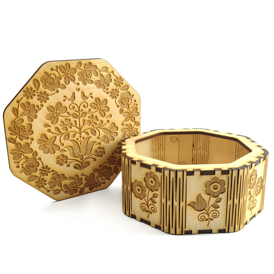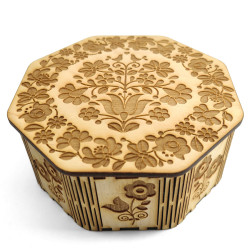 Kalocsai nyolcszögletű fa díszdoboz, gravírozott