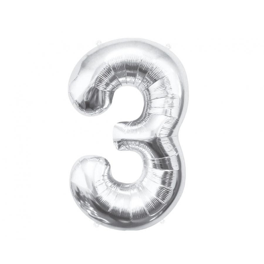 Silver, Ezüst 3-as szám fólia lufi 85 cm