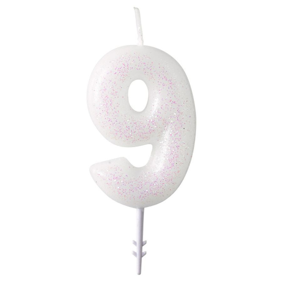 White, Fehér csillámos gyertya 9-es 6,5 cm